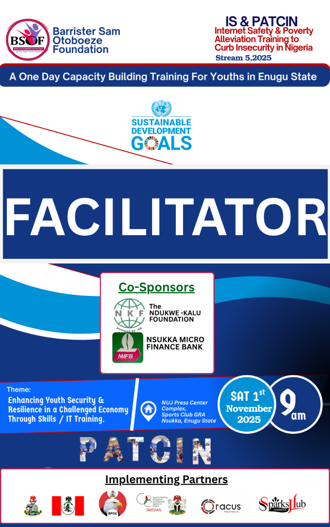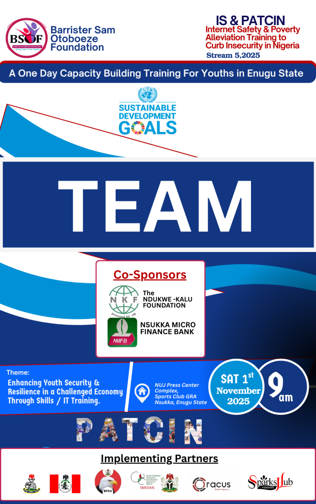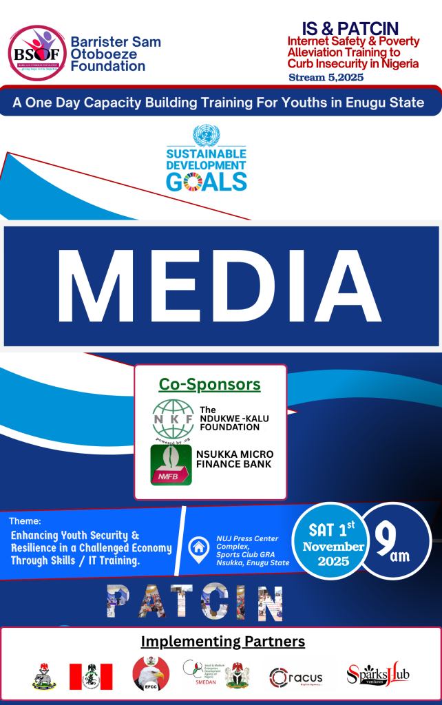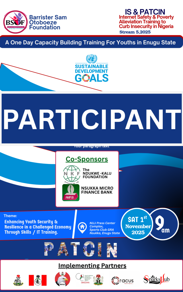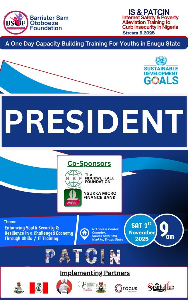The Barrister Sam Otoboeze Foundation (BSOF), in partnership with the Ndukwe Kalu Foundation and Nsukka Microfinance Bank, has successfully concluded the PATCIN 2025 Youth Empowerment Program, a one-day intensive training aimed at addressing the root causes of insecurity through digital literacy, entrepreneurship, and crime-avoidance education.